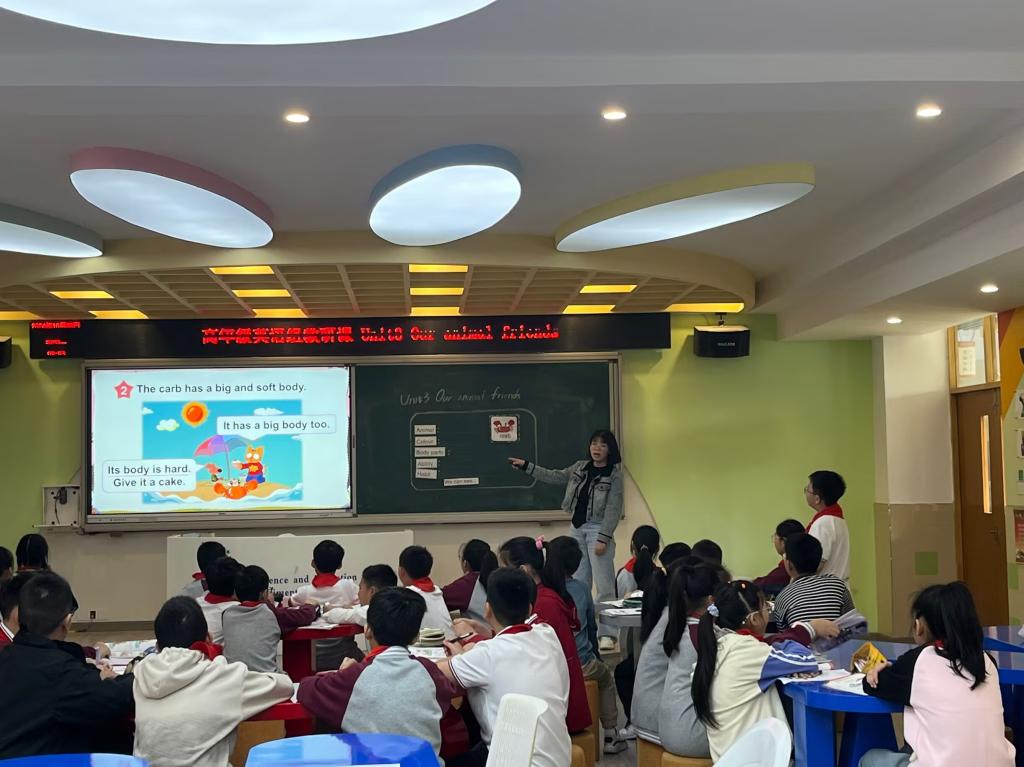 10月23日下午,英语组全体教师集中英创教室观摩五年级课例Unit3 Our animal friends(Story time)。活动构建 “物理 - 数字 - 生活” 三维学习空间:物理课堂设小组探究区与成果展示区,供学生协作设计跨学科思维导图;数字空间嵌入动物科普视频与英语动画,联动语言学习与科学认知;生活空间延伸至课前观察与课后实践,让英语学习贴近生活。教学中,以英语单词、句型运用为核心,融合科学(动物特征观察)、美术(思维导图创作)、德育(人与动物和谐相处)知识,通过 “短时长、多频次” 空间切换与角色分工,提升课堂效率。同时,采用 “英语语言 + 跨学科能力 + 空间适应” 三维评价体系,全面衡量学习效果。