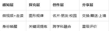 1.任务群分层设计 感知层:通过校园实景观察、视频播放、图片欣赏等方式,引导学生感知校园环境的美与特色,激发“我是校园小主人”的身份认同。 探究层:引导学生观察自己与新朋友的外貌特征,探索名片设计中的图形、色彩、文字组合方式,理解校园文化与自我表达的关系。 创作层:以“设计我的个性名片”“画一画我的新朋友”“描绘我们的校园”三大任务为载体,开展绘画、剪贴、手工制作等跨媒介艺术实践。 分享层:组织“名片交换日”“我的新朋友作品展”“校园绘画墙”展示活动,通过讲述与互评深化同伴互学与情感交流。 2.跨学科融合策略 语文学科:结合“自我介绍”“我的朋友”口语表达任务,引导学生用简洁语言描述作品创意与校园印象。 数学学科:运用图形知识设计名片外形,理解对称、组合、空间等概念。 综合实践:组织学生实地观察校园,记录感兴趣的场景,培养观察与记录能力。 二、趣味性与有效性保障机制